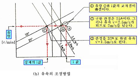 그림 2.44(b)에서 Q와 i에 의해 구한 관경은 25[A]이다. 그러나 유속이 2.5[m/s]이므로 2.0 [m/sec]이내가 되도록 하려면 관경을 32[A]로 수정해야 한다. 이때의 유속은 1.5[m/s]이다.