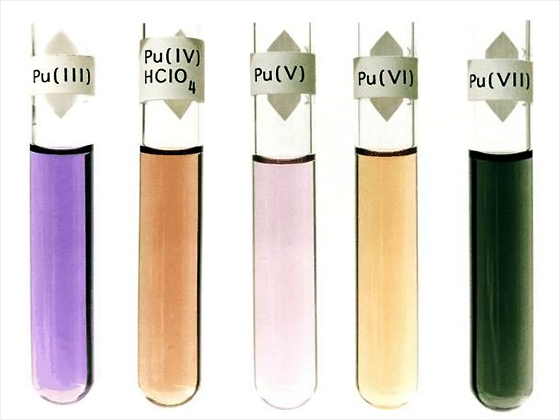 용액에서 산화 상태에 따라 여러 색을 띠는 플루토늄 이온 <출처: US. DoE>