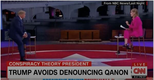최근의 언론이 몰두하는 주제는 큐애넌 QAnon(미지의 Q 라는 지도자를 중심으로 어나니머스 대중이 결집했다는 의미의 신조어, 역자 주)이며 또 최근 NBC 타운홀 이벤트입니다. 그것은 질의응답 세션으로 청구되었음에도 불구하고 트럼프 대통령과 NBC의 당파성 뉴스 진행자 사바나 거스리 간의 논쟁 수준으로 비화했습니다.