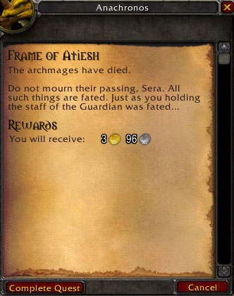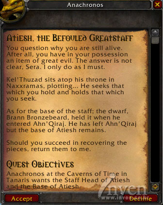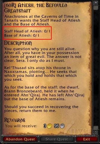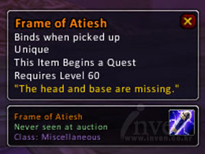아나크로노스는 수호자의 지팡이의 완성을 위해 아티쉬의 머리부분 (Staff Head of Atiesh)과 아래부분 (Base of Atiesh) 을 가져오라고 하는데,