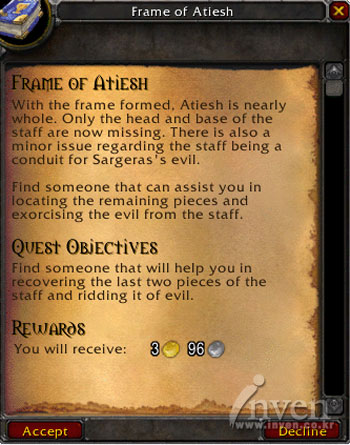 낙스라마스의 주인 켈투자드를 공략하는 등의 험난한 가시밭길을 헤치며 메디브의 지팡이, 아티쉬를 완성해야 하는 임무는 다름아닌 현재 월드오브워크래프트의 역사를 만들어가고 있는 유저들의 손에 달렸다.
