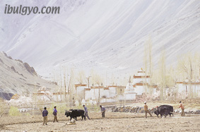 인더스강변에서 상념에 빠져있는데 어디선가 “이랴”하는 소리가 들렸다. 알치사원 주변 논밭에서 일하는 농부들이 소몰이하는 소리였다. 천천히 걸어 일하고 있는 농부들에게 다가갔다. 알치사원 옆에서 열심히 일하는 농부들과 소는 마치 가족처럼 보였다. 우리나라 농촌처럼. 사람과 동물의 얼굴엔 근심이 없어보였고, 그들을 키워주는 자연 역시 아무런 걱정이 없어 보였다. 그 사이에서 알치사원의 살구꽃이 미소 짓고 있었다.