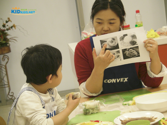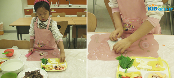교사 : 쌀종이 가운데 채소를 모두 넣었으면 양쪽 날개로 채소를 넣어주고 아래쪽 이불도 덮어주자. 그다음엔, 또로로로로 동그랗게 말아 보는 거야