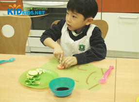 교사 : 말랑말랑 해진 쌀종이를 동그랗게 펼치고 땅콩버터를 살짝 찍어 넣고 우리가 자른 여러가지 채소를 넣어보자.