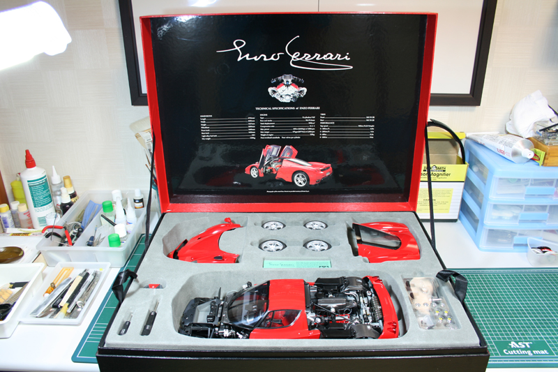 투껑을 열면 투껑 언쪽에는 엔쵸페라리의 사양이 자세하게 인쇄되어 있고 고급스런 플로킹 몰드속에 자동차와 부품이 들어 있습니다.