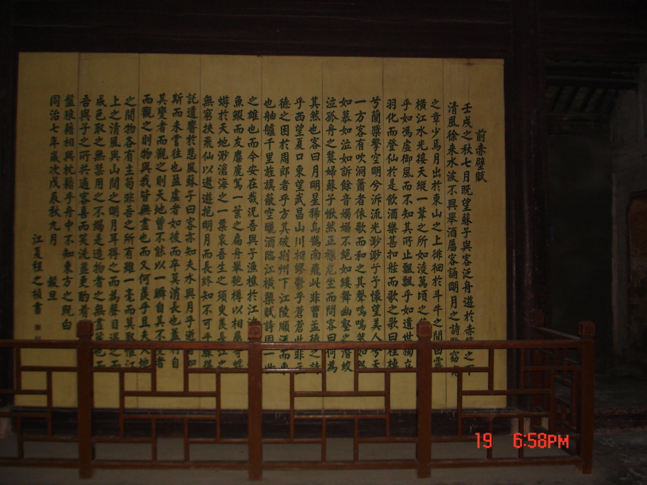 문적벽은 송나라 신종 5년(1082년) 7월 16일 밤 소식의 나이 47세 때 붉은 암벽이 깎 아지른 듯 솟은 창장(長江·양쯔강)의 적벽에 배를 띄워놓고다음과 같이 인 생과 우주를 노래한 글이다.