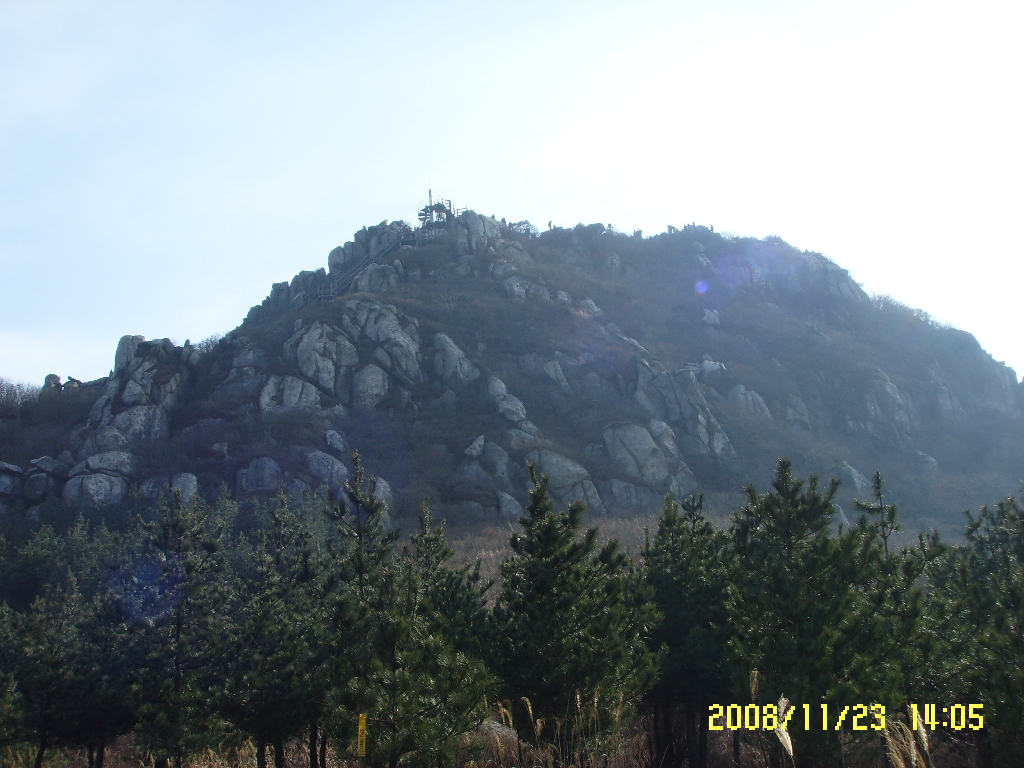 고당봉아래 소나무 숲사이로 본 고당봉, 이미 올라 있는 사람들의 모습이 또렷이 보인다.