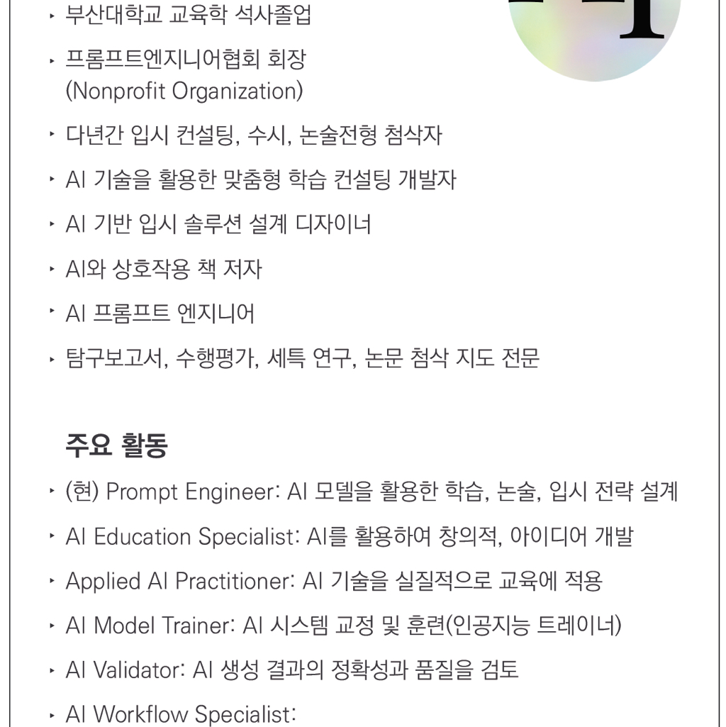 전 시니어 도메인 아키텍처 프롬프트 엔지니어로.. 어느 분야 상관없이 AI를 활용하여 최적의 결과물을 내는 수준, 즉 그 직군에 속해 있습니다. 이런 직군이 입시에 세특을 분석하고 AI와 협업하며 콘텐츠화를 시킨다는 건, 사실 흔하지 않은 일입니다.