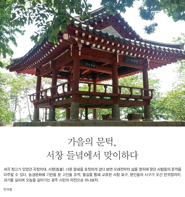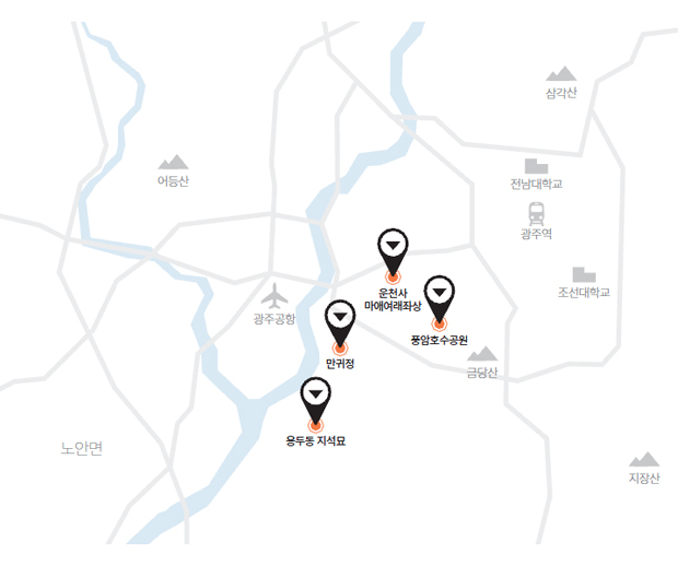 추천 여행 코스 : 용두동 지석묘- 만귀정 - 운천사 마애여래좌상 - 풍암호수공원 01 운천사 마애여래좌상 | 광주광역시 서구 쌍촌동 원효대사가 서쪽 하늘에 상서로운 기운이 서린 것을 보고 제자를 보냈더니, 큰 바위에서 빛이 솟아 나오므로, 그곳에 마애불을 새겼다고 한다. 1974년 광주광역시 유형문화재 제4호로 지정되었다. 02 풍암호수공원 | 광주광역시 서구 풍암동 460 1956년 농업용으로 축조된 저수지를 풍암택지 개발 이후 1999년 국토공원화 시범사업을 통해 공원으로 조성했다. 전통정자와 목교 등을 설치한 공원은 자연과 전통이 조화를 이루는 광주의 상징적 쉼터가 되었다.