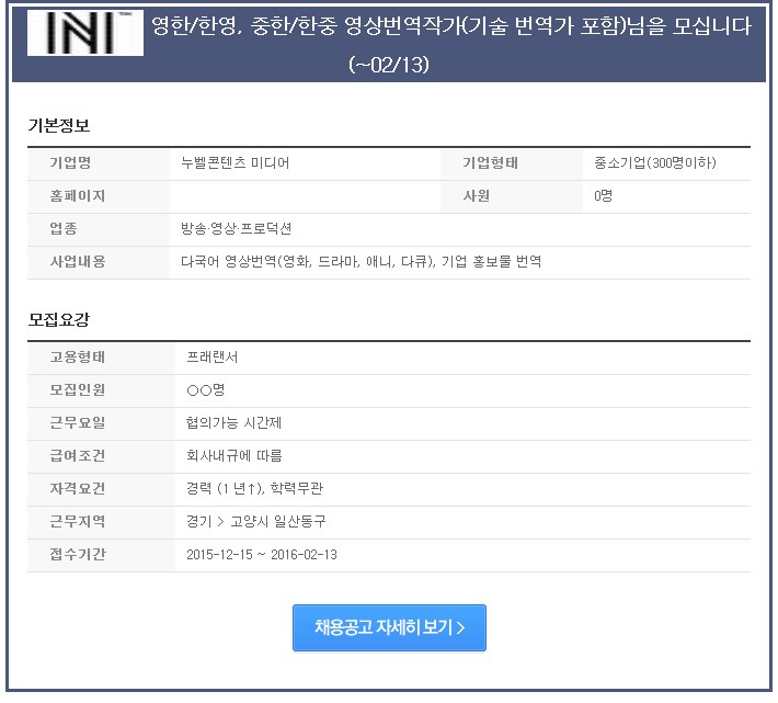 사무/관리/무역/영업/기타 직종 구인광고 중한/한중 영상번역작가(기술 번역가 포함)님을 모십니다 (~02/13)