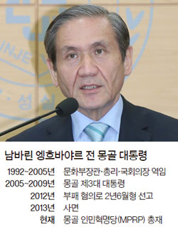 남바린 엥흐바야르(56) 전 몽골 대통령이 최근 한국에 망명했다고 한국 정부 당국자가 밝혔다. 외국 전·현직 국가 원수가 한국에 망명한 건 처음이다. 엥흐바야르의 망명은 그가 대통령 시절 행한 부패 혐의로 퇴직 후 유죄 판결을 받았던 사실과 관련이 있는 것으로 추정된다.