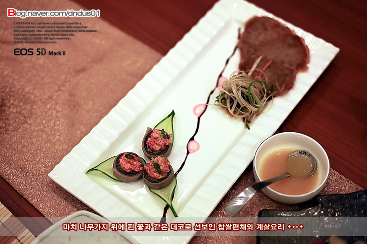 1. 위치 : 대치동 은마아파트 입구 사거리 2. 주차 : 가능, 발렛파킹비 1천원 (사설주차장이용시 1시간비용부담) 3. 가격 : 점심 2만원, 저녁코스 3만원~10만원까지 다양 4. 음식 : 정말 올만에 제대로 된 요리맛을 보았네요. 직접 느껴보세요 : ) 5. 실내 : 다양한 테이블과 룸으로 컨셉에 맞게 기념일과 경조사를 챙길수 있을듯 싶네요. 6. 서비스 : 미소 가득한 친절함이 보는이로하여금 미소 짓게 하네요