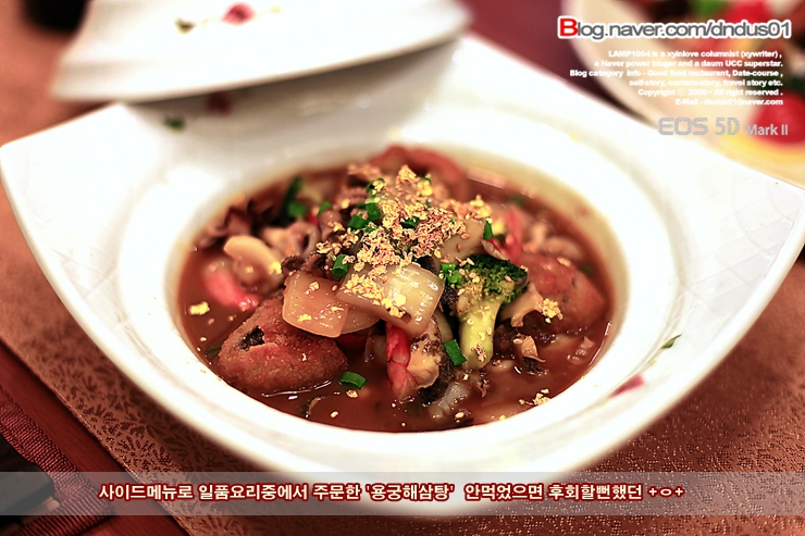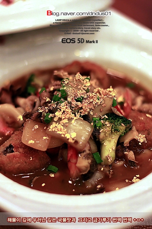 금가루가 뿌려진 걸죽한 해물누룽지탕의 진한 맛이 느껴지는 일품요리 용궁해삼탕