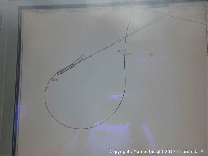 This is the fastest recovery method. It is most appropriate turn for ship in clear visibility. In case of this turn, rudder is put hard over to the side of the casualty. After deviation from the original course by 250 degrees, rudder is put to midship position. Revolution needs to be modified at the end of the turn and stopping manoeuvre is initiated.