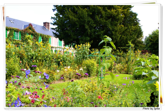 기념품 가게을 통과하여 정원입구를 찾아 들어가면 정리되지 않은 듯이 흩어러진 꽂들과 풀들… 다듬은듯 아닌듯…어찌보면 조잡스럽게 보이기까지 한 정원이 두눈에 들어옵니다. 해바라기를 비롯한 많은 꽂들이 눈을 어지럽히며 피어있고 한켠엔 길다란 초록과 파랑의 모네의 집이 있습니다. 모네의 집은 사진을 못찍게 하여 그냥 눈동냥만 하고 나왔습니다. 1층보다 약간 낮은 모네의 작업거실엔 모네의 사진과 모네의 모작만이 모네를 대신하고 있었습니다.