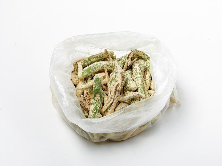 3. 봉지에 콩가루와 꽈리고추, 멸치를 넣고 흔들어 가루를 입히고,