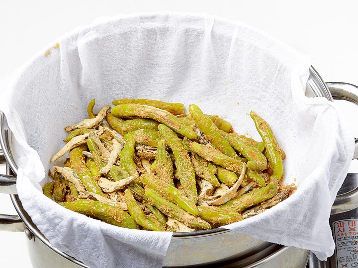 4. 찜기에 젖은 면포를 깔고 김이 오르면 고추와 멸치, 콩가루를 넣어
