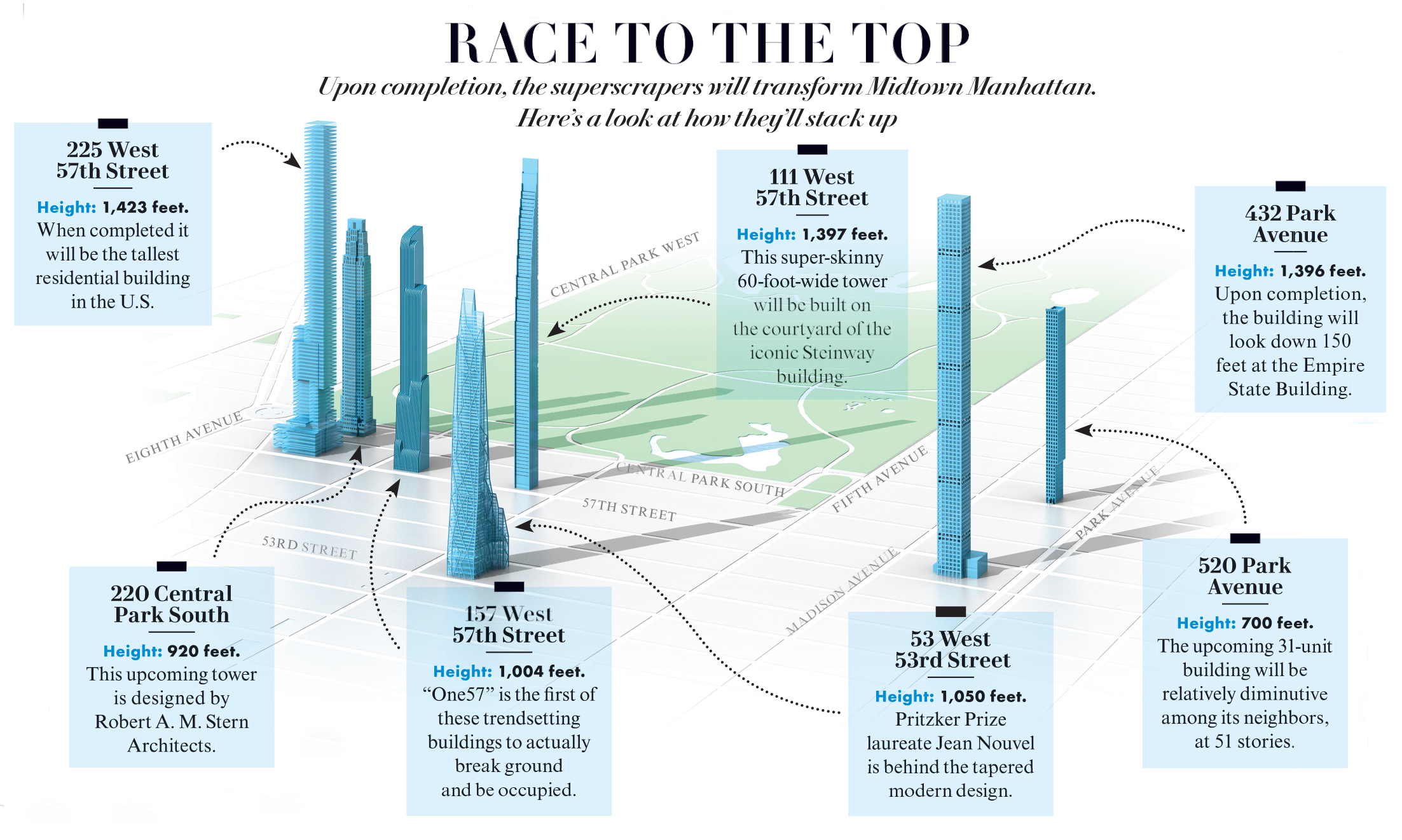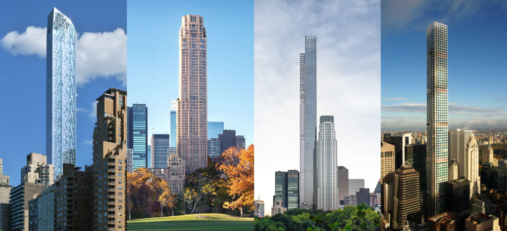 슈퍼슬림의 부상: (왼쪽에서 오른쪽으로) One57 , 220 Central Park South , Central Park Tower , 432 Park Avenue .