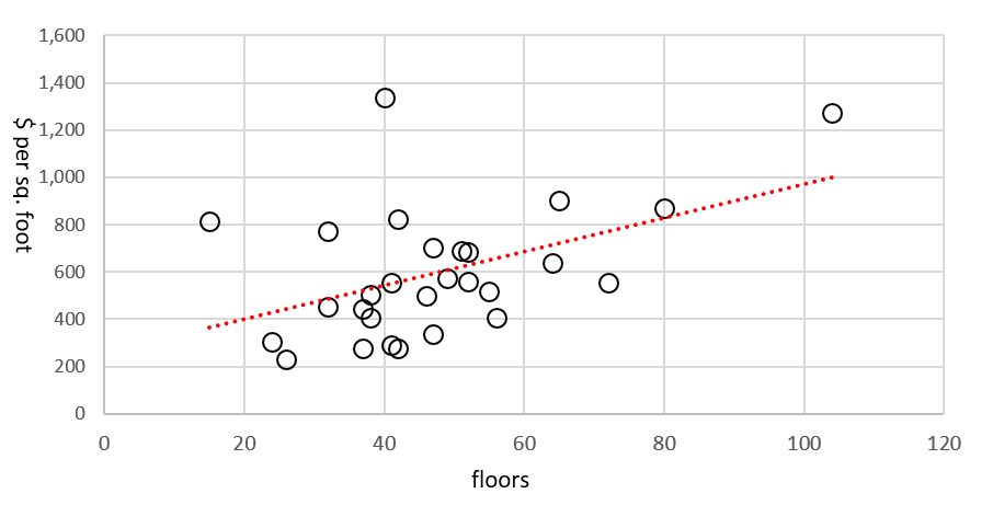 그림 1은 맨해튼 건설 비용의 예를 보여줍니다. 이 그림은 2001년부터 현재까지 건설된 28개 프로젝트의 건물 높이 대비 건축 면적 평방피트당 인플레이션 조정 비용을 보여줍니다. 즉, 그래프는 평균적으로 20층 건물의 경우 평방 피트당 약 $400(평방 미터당 $4,306)에서 80층 건물의 경우 평방 피트당 약 $800(평방 미터당 $8,611)로 비용이 증가한다는 것을 보여줍니다.