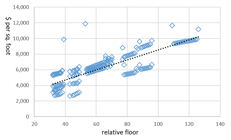 그림 2 는 현재 건설 중이며 95층으로 예상되는 217 West 57th Street (Central Park Tower) 의 예를 보여줍니다 . 그래프는 각 유닛의 평방피트당 예상 수입과 유닛의 상대적 높이를 보여줍니다. 보다 구체적으로, 각 유닛의 크기와 기능을 통제한 후 높이 프리미엄은 각 층 위로 평균적으로 평방피트당 약 $34(평방미터당 $366) 증가합니다.