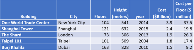 몇 가지 예를 고려하십시오(인플레이션을 고려하지 않은 미국 달러 기준). 원 월드 트레이드 센터(One World Trade Center)의 건설 비용은 거의 40억 달러에 달하며, 상하이 타워의 건설 비용은 2.4달러입니다. 층당 기준으로 보면 비용이 거의 두 배에 달합니다. 부르즈 칼리파는 원 월드 트레이드 센터보다 거의 300m 더 높지만 총 비용은 61% 저렴합니다! 뉴욕에 163층짜리 건물을 15억 달러에 산다는 생각은 우스꽝스럽습니다.