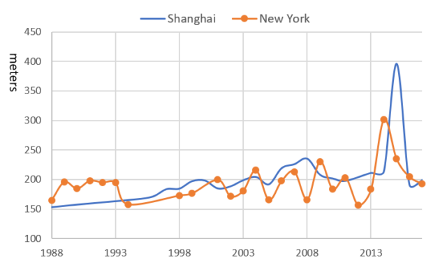 1988년부터 2017년까지 뉴욕과 상하이에 완공된 고층 빌딩의 평균 높이. 여기서 초고층 건물은 높이가 150m 이상인 건물입니다. 출처: 스카이스크래퍼 센터, CTBUH .글로벌 비용