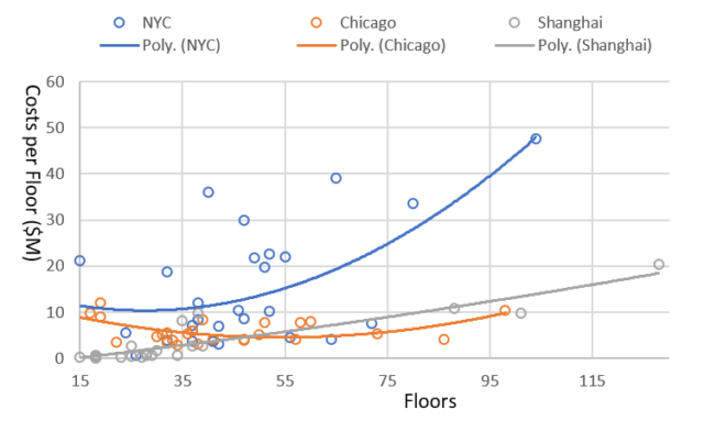 이러한 비용의 구조에 대해 증거는 무엇을 말합니까? 이를 살펴보기 위해 저는 뉴욕, 시카고, 상하이에 최근 건설된 건물에 대한 데이터를 수집했습니다(자세한 내용은 여기 참조 ). 데이터 세트에는 각 건물에 대한 총 구조 비용과 층수가 포함되어 있습니다. 이를 통해 건물이 높아질수록 층당 평균 비용이 어떻게 변하는지 확인할 수 있습니다. 이런 식으로 우리는 초고층 건물 높이의 경제성에 관해 뭔가를 추론할 수 있습니다. 하지만 한 가지 경고 사항이 있습니다. 각 도시의 표본 크기는 매우 작으며 상하이의 공공 주택부터 초고층 사무실, 고급 아파트에 이르기까지 다양한 유형의 구조물을 포함하고 있습니다. 이 분석에서는 다른 사항을 통제하지 않고 층당 비용만 제시합니다. 조사 결과는 예비적인 것으로 간주해 주십시오.