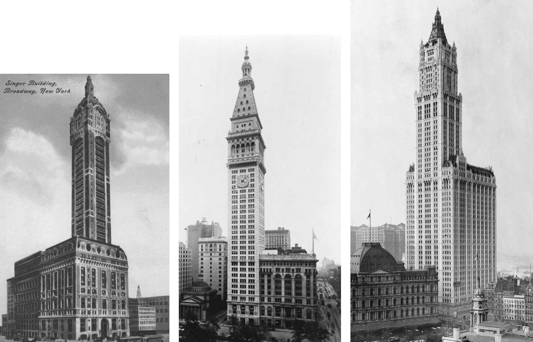 왼쪽에서 오른쪽으로: 싱어 타워(1908), 메트라이프 타워(1909), 울워스 빌딩(1913).