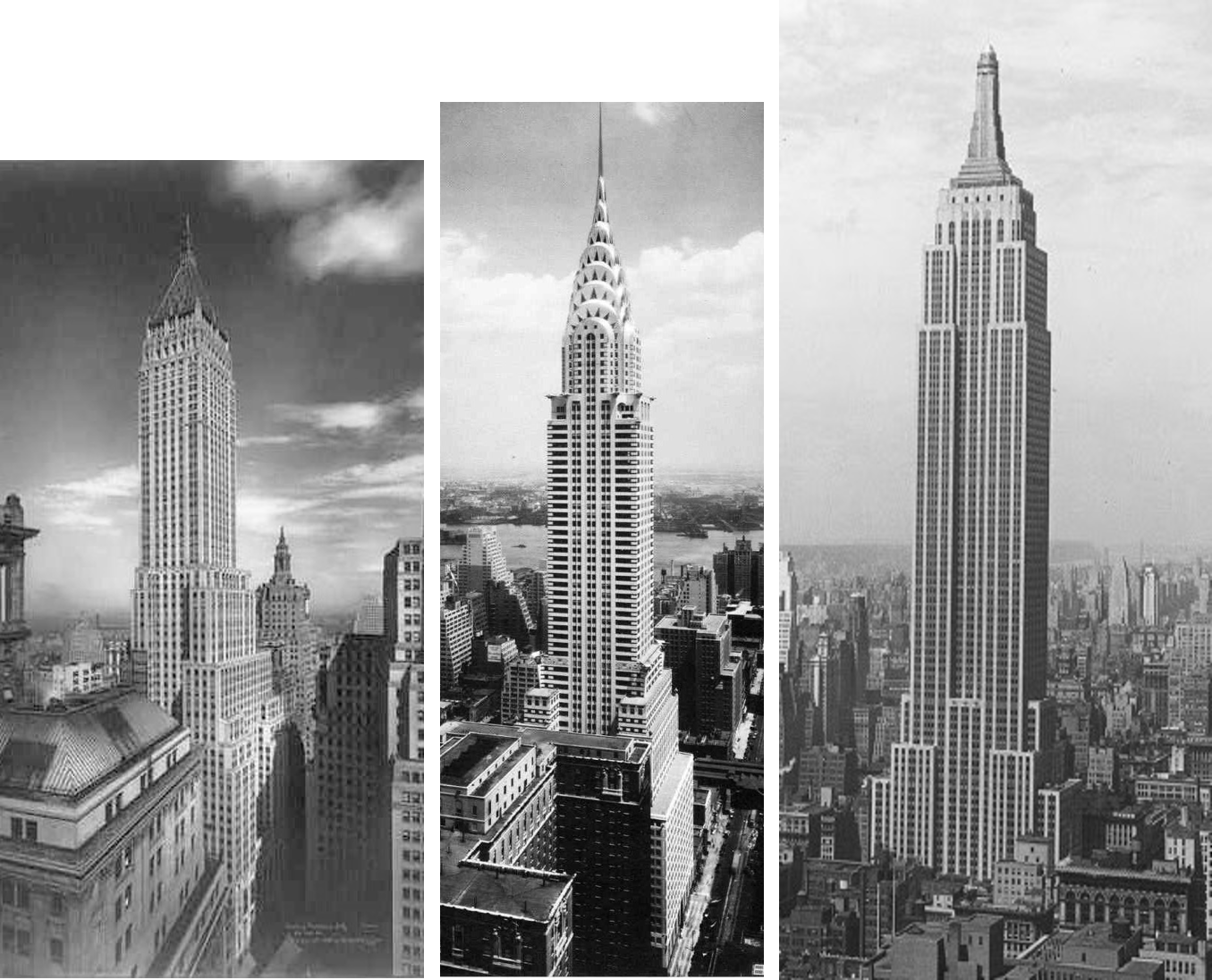 왼쪽에서 오른쪽으로: 맨해튼 은행 빌딩(1930), 크라이슬러 빌딩(1930), 엠파이어 스테이트 빌딩(1931).기록을 깨는 기업의 경제적 분석