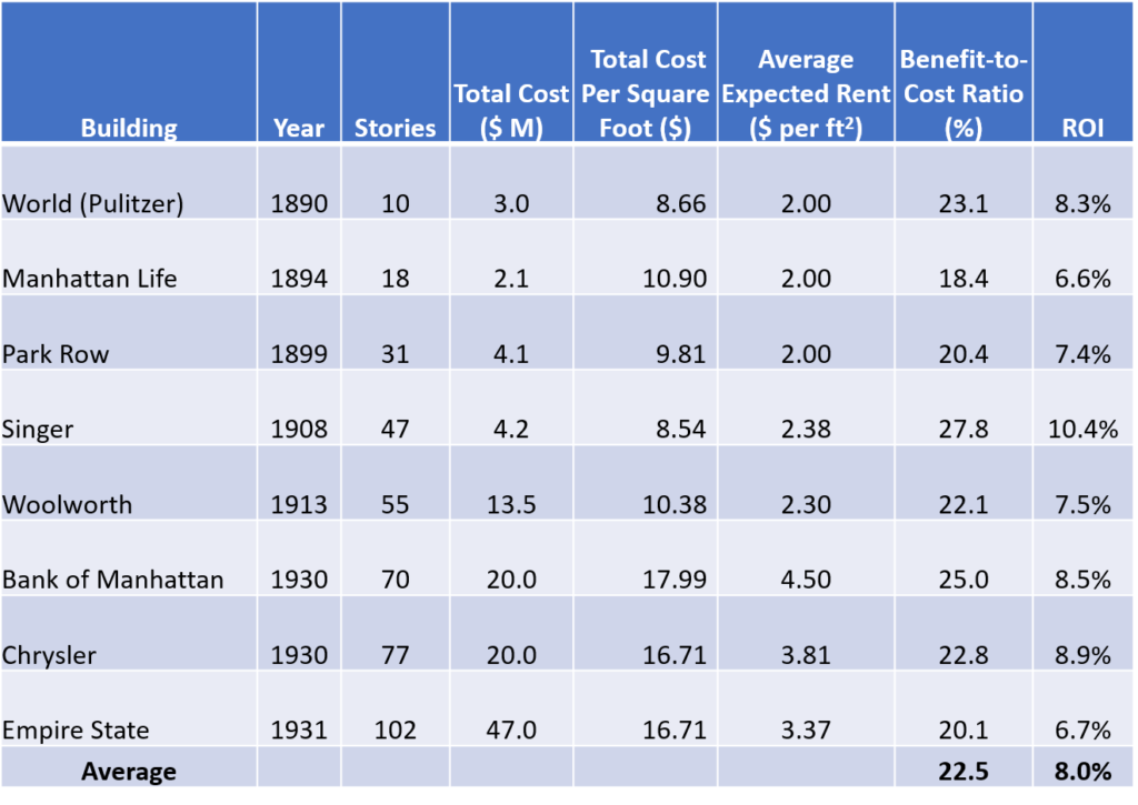 이 데이터를 검토한 결과, 제2차 세계대전 이전에는 기록적인 건물이 경제적으로 타당했다는 결론이 나왔습니다. 실제로 건축비 대비 임대료의 평균 비율은 23%에 육박했다. (18%보다 낮은 곳도 없었다) 이는 평균 예상 투자수익률(ROI) 8.0%로 상당히 높은 수준입니다. 이는 모든 건물이 매우 높은 수익을 올렸다거나 개발자의 기대가 완전히 실현되었다는 의미는 아닙니다. 오히려 이들 프로젝트는 모두 강력한 경제 논리를 갖고 있었고 자존심은 경제에 이어 두 번째였다고 말하는 것입니다.