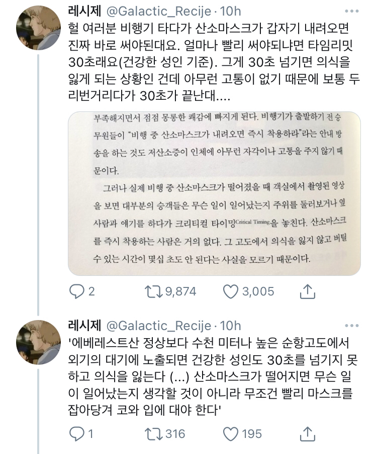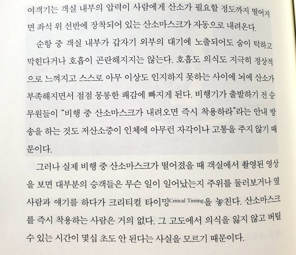 @가을 여행 감압현상 발생시 무조건적으로 30초내에 착용하지않으면 죽는게아니라 고도에 따라 다르고 완만한지 급격한지에 따라 의식가능시간이 달라 저 책에서는 엄청 극단적인 경우를 말한거같고 산소마스크 내려오고 감압현상 발생하면 승무원들이 마스크 쓰라고 샤우팅하게되어있어서 걱정안해도돼