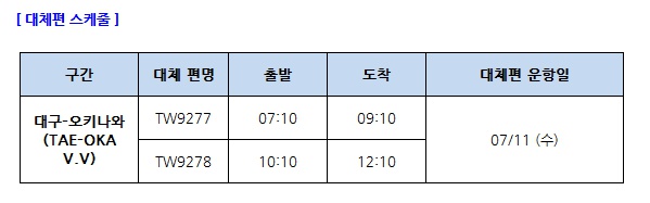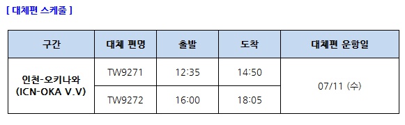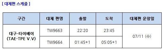 7/11(수)타이페이-부산 7C2654 02: 50 / 06:10 결항 > 7/12(목)타이페이-부산 7C2656 02:55 / 06:15 대체편 운항