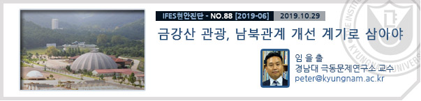 금강산 관광사업이 향후 남북관계의 운명을 가르는 이슈로 부상한 듯하다. 최근 김정은 국무위원장이 금강산관광지구를 현지지도한 자리에서 남측 시설들의 철거를 지시했고, 곧바로 철거를 위한 문서교환 방식의 협의를 제안했다. 남북관계와 북미관계 모두가 좀처럼 돌파구를 찾지 못하고 있는 상황에서 나온 김 위원장의 발언은 우리에게 큰 도전요인이 되는 것 같다. 일단 김정은 위원장의 이번 현지지도 메시지는 금강산관광 이슈를 전면에 내세워 대남, 대미 교착국면을 전환시켜보려는 시도이자 대남, 대미 압박성의 다목적 카드로 읽힌다. 현 단계에서는 북한측의 의도와 전략을 정확하게 간파하는 것이 중요해 보인다. 이를 위해서는 어떻게든 북한의 책임 있는 당국과의 회담을 성사시켜 금강산관광 문제 변화·해결을 통해 남북관계 정상화의 기회로 만드는 것이 급선무라 할 수 있다.