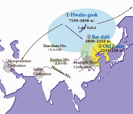 1. 환국(Hwan-gook), 2. 배달국(Baedal), 3. 고조선(Old Joseon), 이렇게 경역이 표시되어 있다.